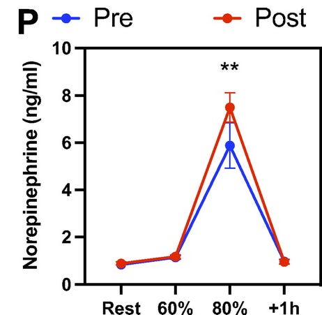 What’s interesting about this study is that it took measures from athletes before vaccination, which actually provided a baseline for these individuals (the study was separated into 3 visits with Visit 1 being pre-vaccination and Visits 2/3 occurring 1-3 weeks post-vaccination). When stratified between pre/post vaccination it appears that Norepinephrine levels were significantly elevated post-vaccination when exercising at 80% maximum oxygen volume, suggesting a possible elevated Catecholamine level associated with vaccination.