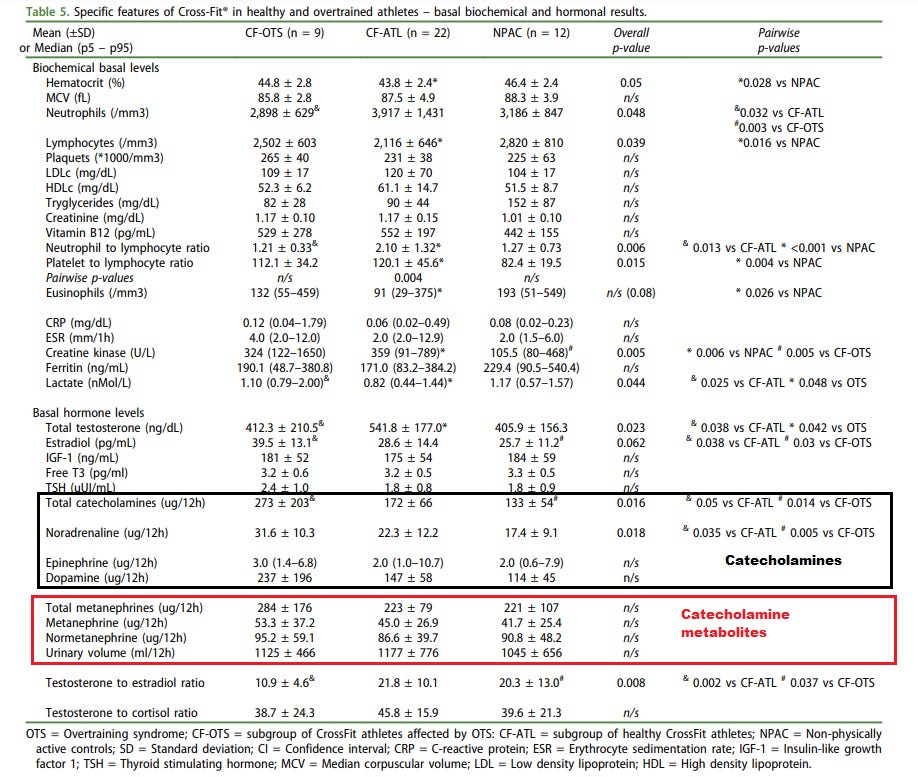 That leaves us with the matter of OTS, which is rather difficult to associate directly with athletes. As Cadegiani outlined in his work overtraining appears to lead to the greatest levels of Catecholamines released when compared to “healthy” athletes or untrained individuals.