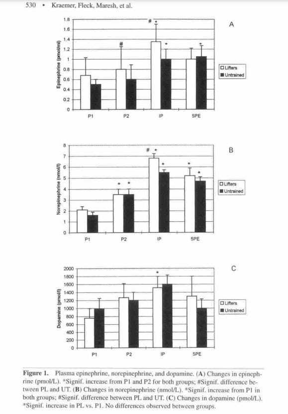In one study by Kraemer, et. al.5 researchers looked at the levels of Catecholamine released after exercise among power lifters and compared them to untrained individuals. Seven male powerlifters and 12 untrained men were tasked with engaging in bilateral leg presses and had blood samples drawn at various time points and measured for Catecholamines. Blood samples were drawn twice pre-exercise (labeled P1 and P2, respectively), once immediately after exercise (PI), and 5 minutes post-exercise (5PE), with the results showing that post-exercise Catecholamine levels were higher than pre-exercise levels. Also, powerlifters tended to show elevated levels of Norepinephrine and Dopamine compared to untrained individuals: