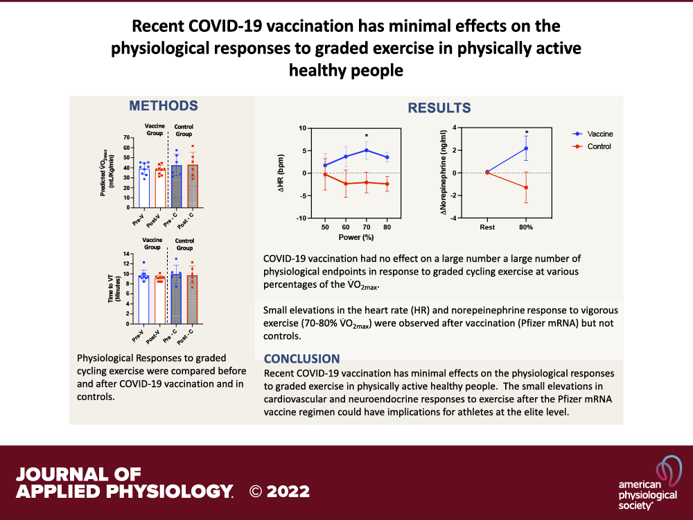 We did, however, find significant elevations in heart rate (∼5 beats/min) and norepinephrine responses to vigorous (e.g., 70%–80% V̇O2max) intensity exercise after vaccination, particularly in those who received the two-dose Pfizer mRNA vaccine regimen. Neither heart rate nor norepinephrine changed in demographically matched control participants who completed identical bouts of exercise several weeks apart without receiving a vaccine. Although it is possible that these effects are due to reduced physical activity levels after vaccination (e.g., due to symptoms of vaccinosis), we deem a detraining effect unlikely as, despite reporting many of the common symptoms associated with COVID-19 vaccination, our participants did not report significant changes to their physical activity levels during the study period. The mechanisms by which recent COVID-19 vaccination might increase cardiovascular responses to graded exercise in healthy people are not known, although the elevated heart response after vaccination may have been driven by the concomitant elevation in the norepinephrine response to exercise (20). A more detailed examination of the cardiovascular and neuroendocrine responses to graded exercise after COVID-19 vaccination would be illuminating.